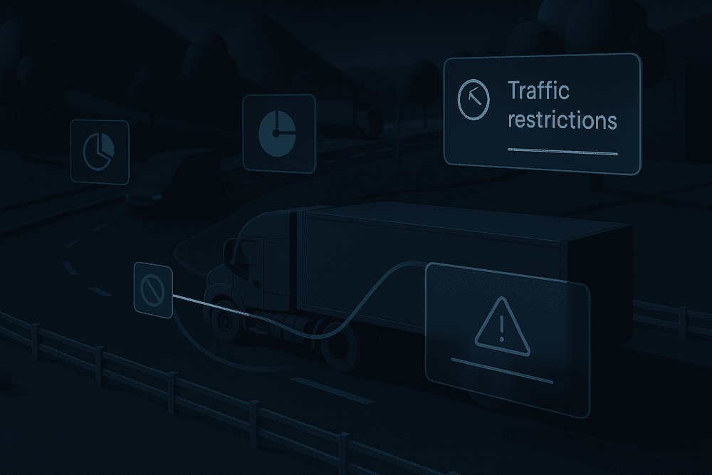 Gaukite realaus laiko pranešimus apie eismo draudimus, laikinas uždarytas atkarpas, policijos ar muitinės patikras ir „Mobilumo paketo“ reikalavimų vykdymą visoje Europoje. Planuokite maršrutus taip, kad išvengtumėte baudų, vėlavimų ir nereikalingų apylankų, užtikrindami atitiktį kiekviename žingsnyje.